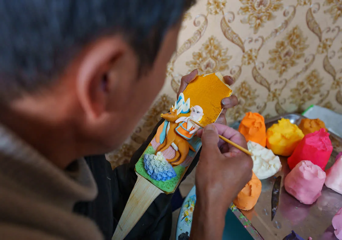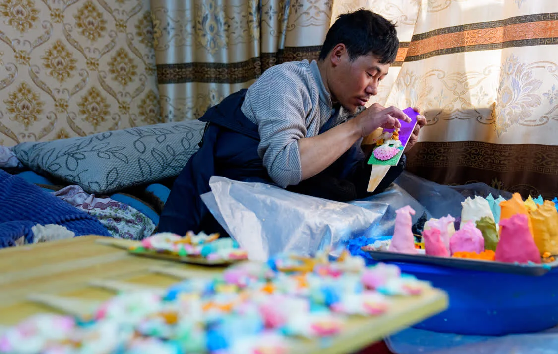 春节、藏历新年临近,拉萨年味渐浓。酥油花作为藏族群众的年货之一,渐走俏市场。 酥油花以色彩鲜亮的酥油为原材料,经手工艺人在冷水里反复揉捏定型降温后,用木刀精雕成日月星辰、花叶藤蔓及动物造型,再拼接粘贴在盾形木板上,制作成栩栩如生的酥油花作品。 一朵朵制作精良的酥油花,传递着对新年的美好祝福。