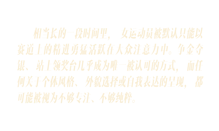 与此同时,关于竞技体育的讨论未能全然剥离性别叙事,在公开场合的访问以及大众讨论中,女运动员常常被置于运动成绩之外的性别审视之下,针对女运动员是否应当带妆参赛的质疑声不绝于耳,这让人不禁思考——化妆与爱美妨碍运动了吗?究竟从何时起,化妆与女性捆绑得如此紧密,以至于该不该化妆成为衡量女性价值的一种必要标准?