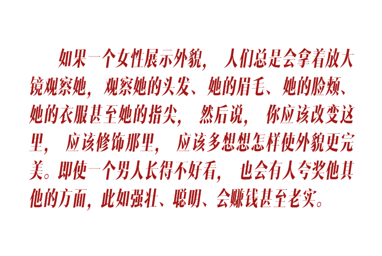 更重要的是,当女性被持续安置在“美的承担者”这一角色之中,美便从一种可能的表达,转化为一项社会分工意义上的义务。女性不仅要“看起来好”,还要为公共空间提供愉悦的视觉体验,为秩序与和谐承担情绪与感官层面的劳动,而这一劳动往往被自然化、被浪漫化,却鲜少被承认为真正的付出。这也解释了为何女性的外貌始终被纳入道德与能力评判之中——美不仅是资本,更是一种可被随时调用的评价工具。