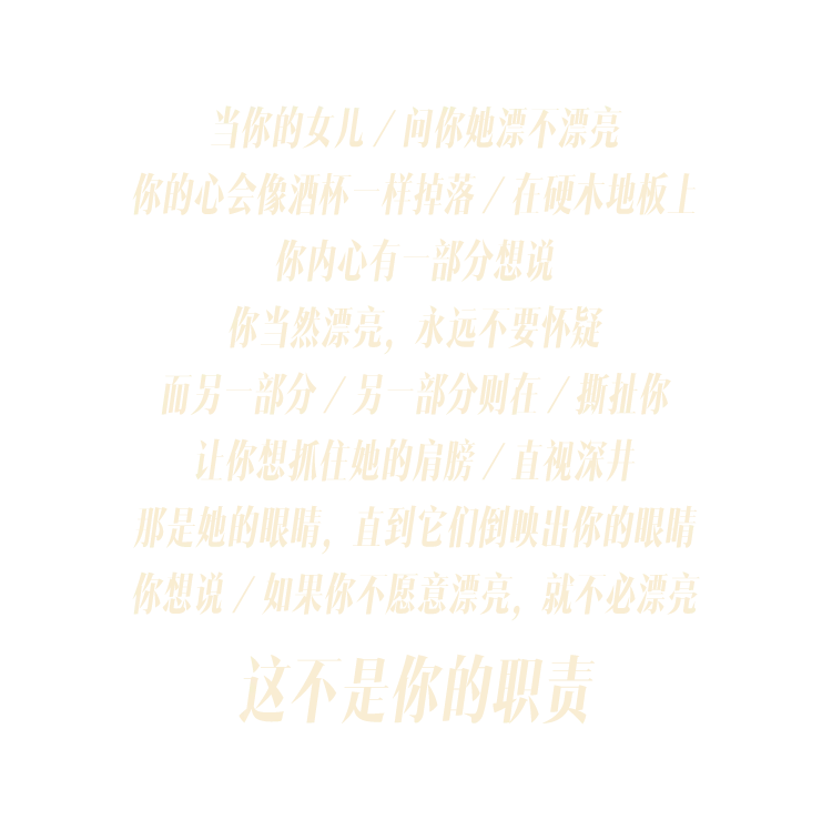 当爱美不再作为女性必须完成的角色任务,只是众多可能性中的一种,爱美的女性,才真正拥有了自由的可能。那种自由,让人想起凯特琳·西尔(Caitlyn Siehl)的诗作《这不是你的职责》——
