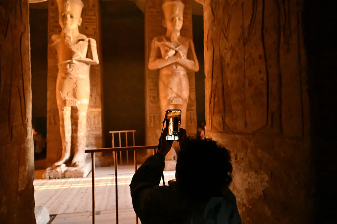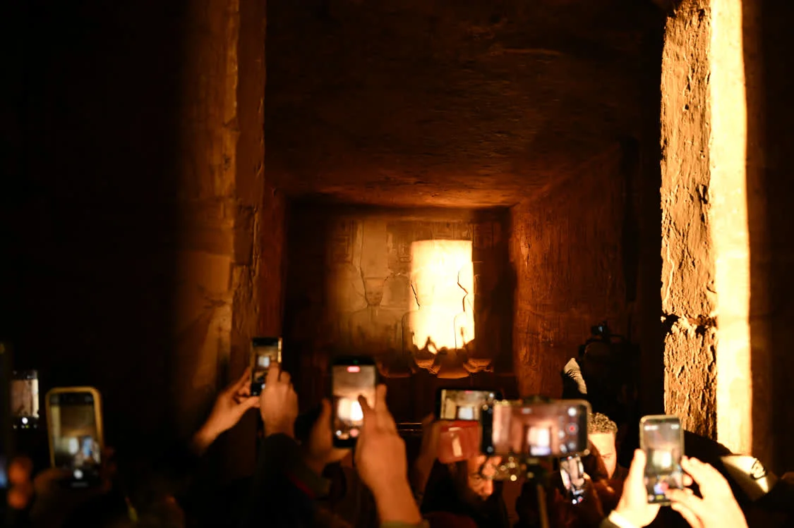 2月22日,在埃及南部阿斯旺省的阿布·辛拜勒神庙,游客拍摄被阳光照亮的神庙内部。新华社记者 辛梦晨 摄