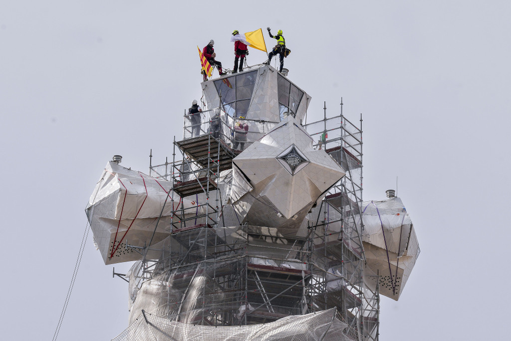 当地时间2026年2月20日,西班牙巴塞罗那,圣家族大教堂完成中央耶稣基督塔顶部十字架吊装。视觉中国 图
