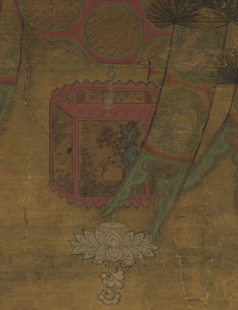 天灯是清代宫廷过年重要的礼仪用灯,彻夜长明。画面中的天灯以圆木为柱,柱身包金,雕云龙纹,靠近顶端有龙形横梁,龙口街一花灯,顶部装五色小亭,非常华丽。相较于宫廷,民间的花灯大多是拟形灯,生动活泼,富有创意。