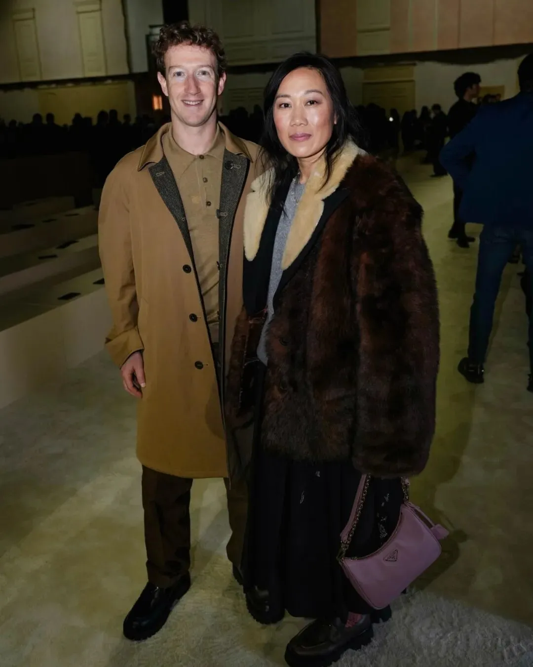 看秀时,扎克伯格换上笔直坐姿,比上听证会还认真。更逗的是普利希拉还给老公讲解T台上的叠穿细节,像极了“老婆带老公逛街买衣服”,两人脚上还穿了同款情侣Prada乐福鞋。