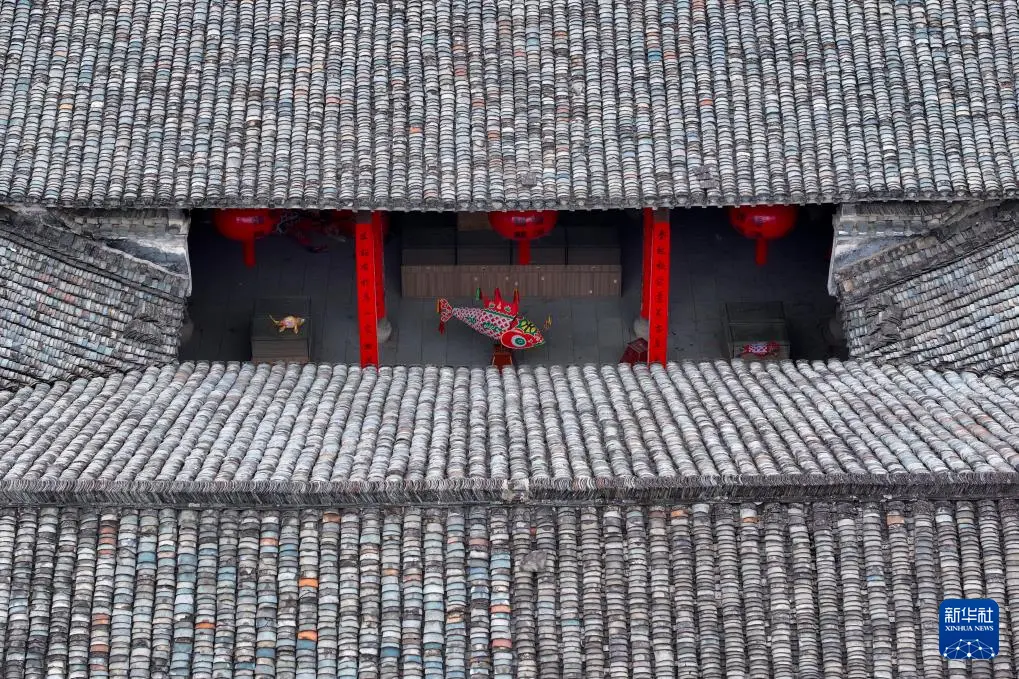 2025年3月24日,在安徽省黄山市歙县徽城镇渔梁社区,人们在观看当地鱼灯队表演(无人机照片)。