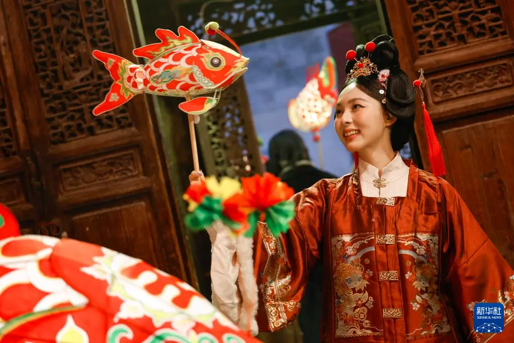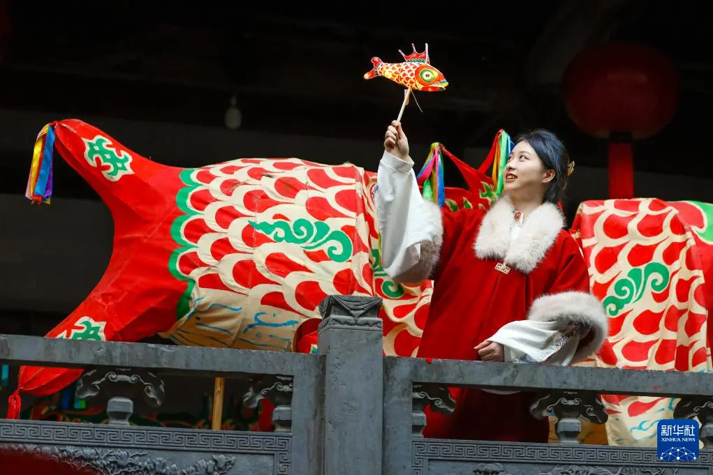 2025年12月19日,在安徽省黄山市歙县徽州古城,演员手持汪满田鱼灯表演。