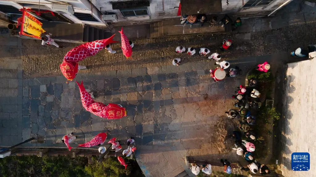 2月14日,在安徽省黄山市歙县北岸镇瞻淇村,鱼灯表演队在街巷中巡游。