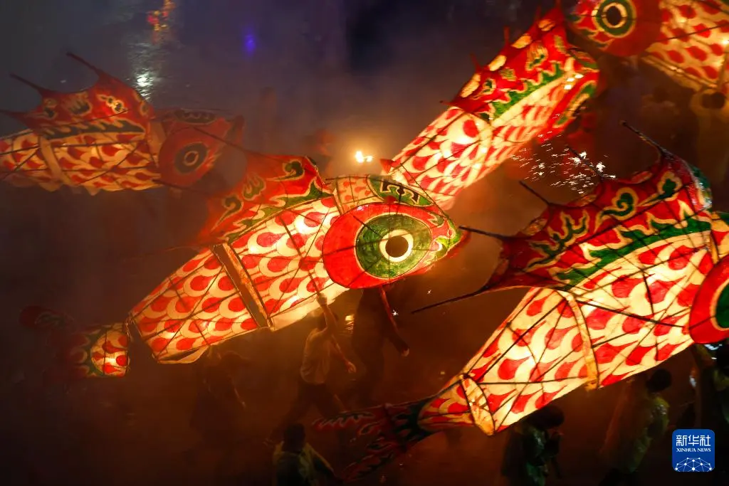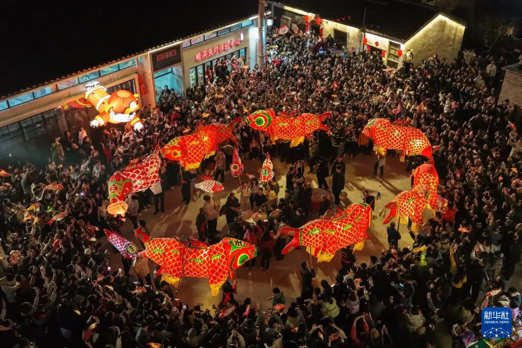 3月1日,村民在安徽省黄山市歙县溪头镇汪满田村嬉鱼灯。