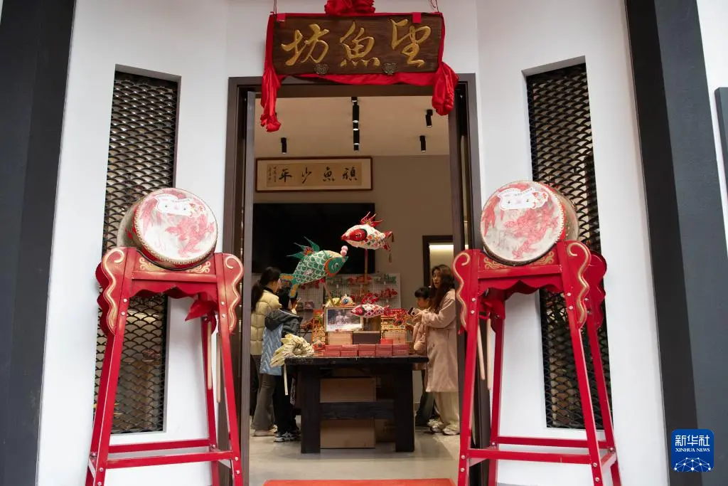 1月29日,在安徽省黄山市歙县北岸镇瞻淇村,工作人员在一家店铺内展示售卖的鱼灯文创。