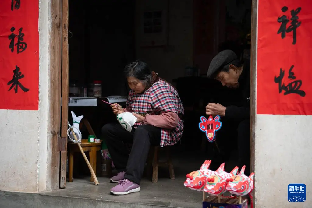 3月1日,安徽省黄山市歙县北岸镇瞻淇村村民在制作鱼灯。