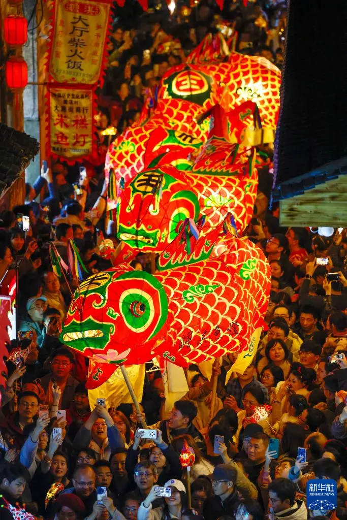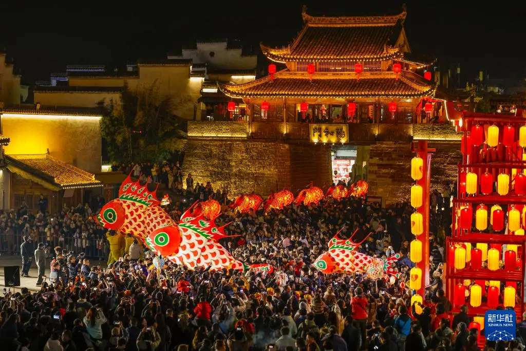 2月4日,在安徽省黄山市歙县徽州古城,人们在观看渔梁鱼灯队表演。