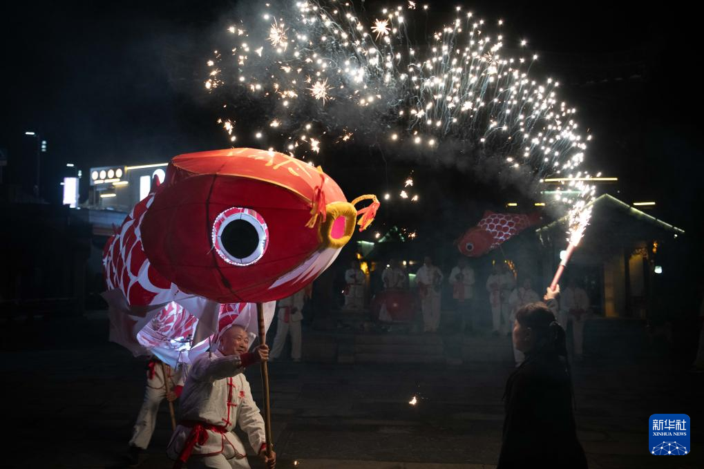 2月28日,在安徽省黄山市歙县徽城镇渔梁社区,当地鱼灯队在表演。