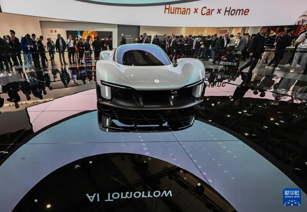 这是3月2日在西班牙巴塞罗那举办的世界移动通信大会上拍摄的小米展台的一款汽车。