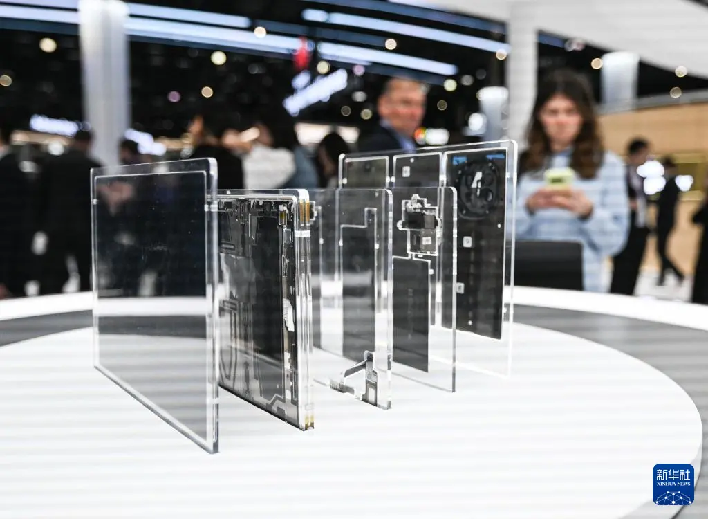 3月3日,在西班牙巴塞罗那举办的世界移动通信大会上,参观者在华为展台观看折叠屏手机的内部结构。