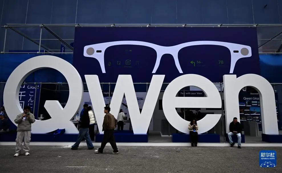 3月2日,在西班牙巴塞罗那举办的世界移动通信大会上,参观者在千问展台参观。