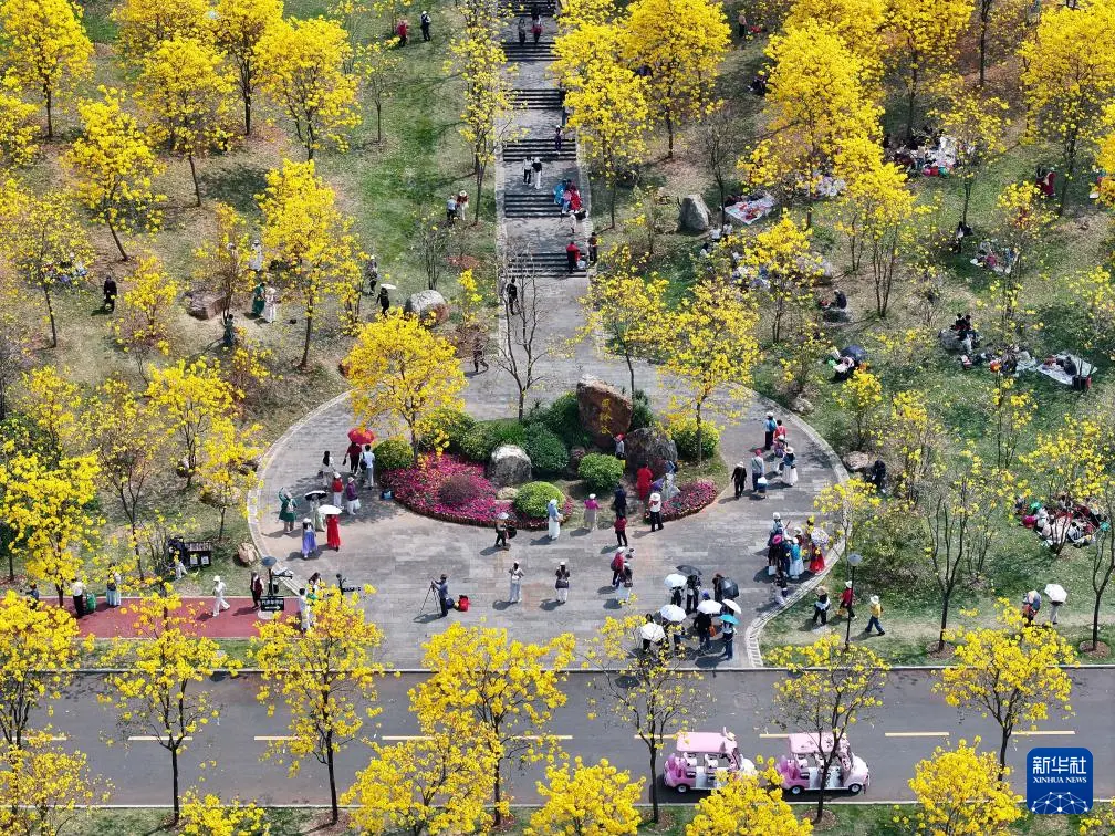 3月5日,游客在广西南宁市青秀山风景区黄花风铃谷赏花踏春(无人机照片)。