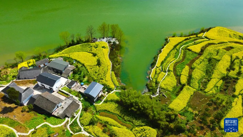 重庆市黔江区阿蓬江镇大坪村油菜花开放(3月4日摄,无人机照片)。