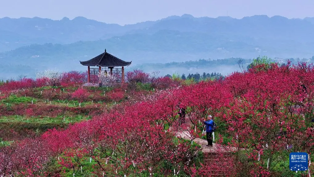 3月5日,游客在四川省泸州市纳溪区上马镇的桃林里赏花游玩(无人机照片)。