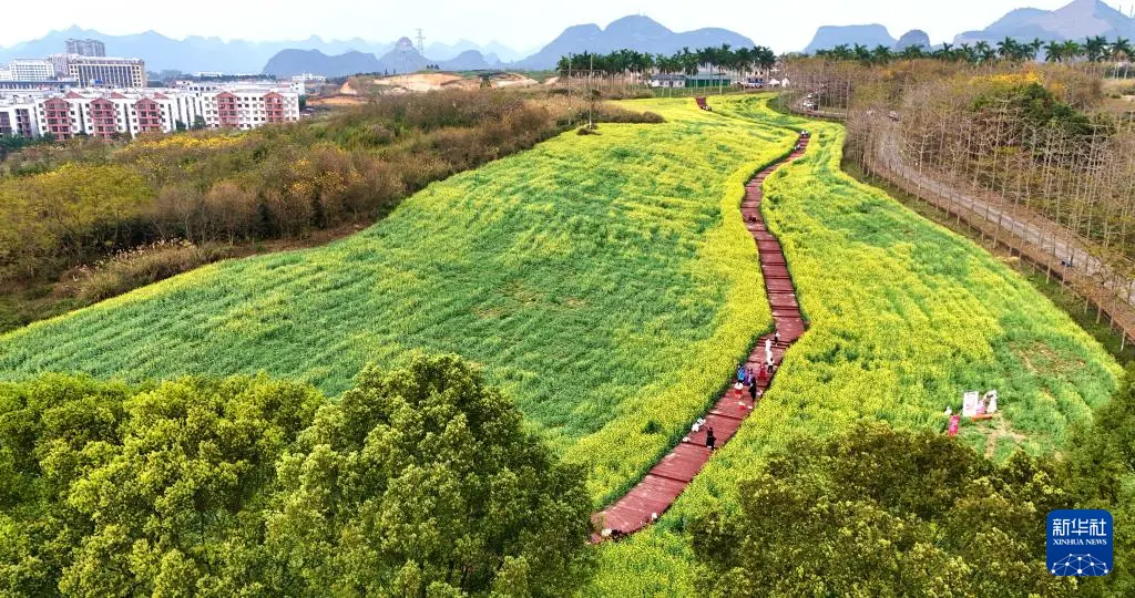 3月5日,游客在广西来宾市忻城县的油菜花田中游玩(无人机照片)。