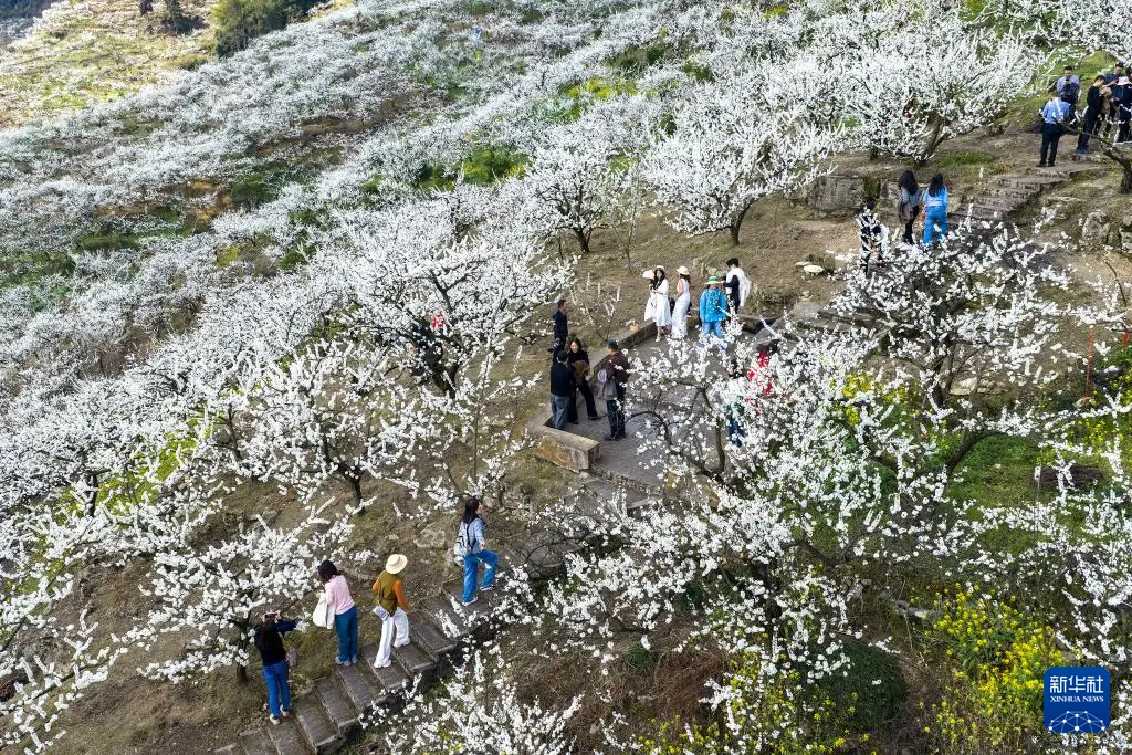 3月4日,游客在重庆市北碚区统景镇印盒李花生态旅游区游玩(无人机照片)。