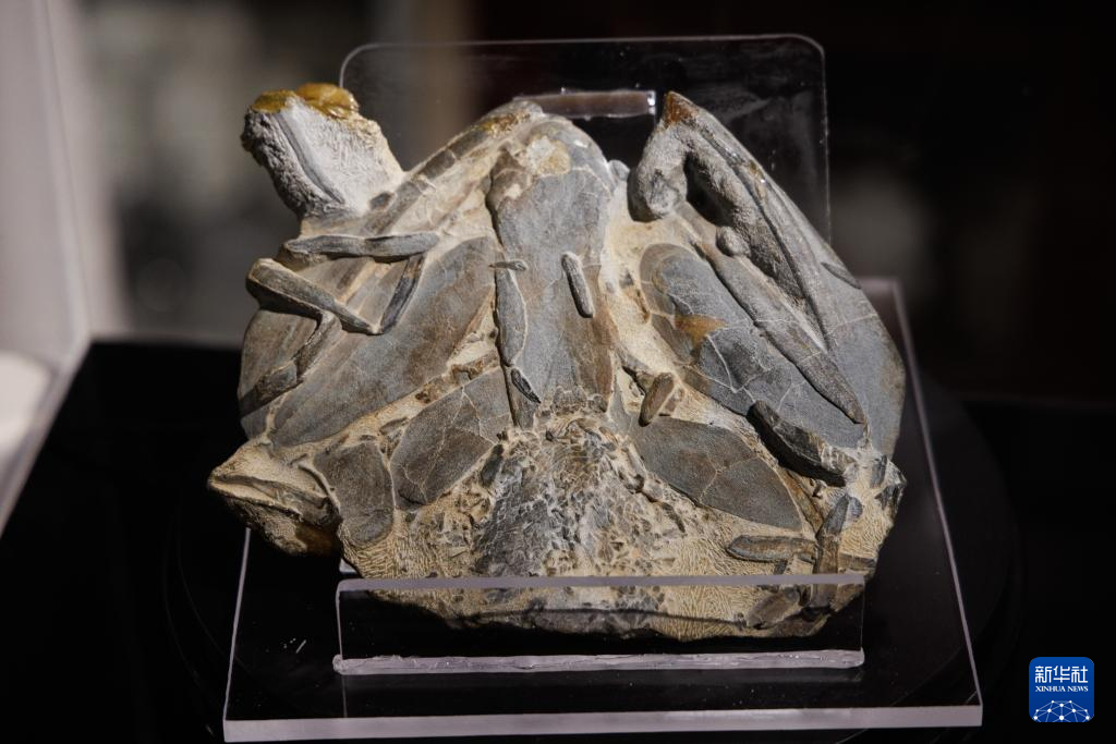 3月3日在中国科学院古脊椎动物与古人类研究所举行的新闻发布会上拍摄的钝齿宏颌鱼化石。