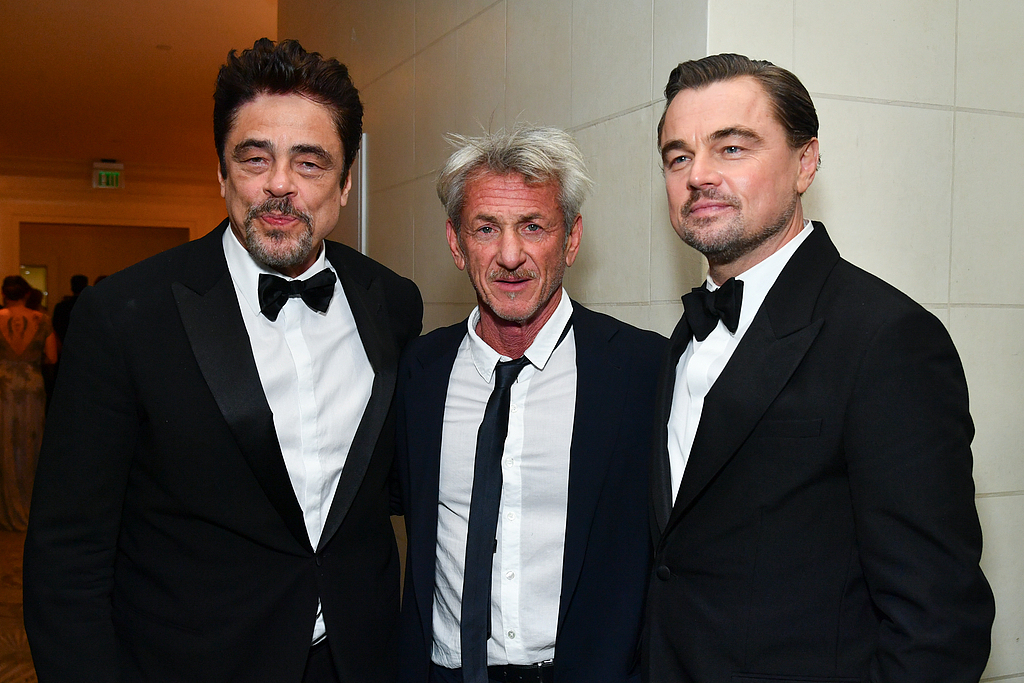 西恩·潘(中)此前与本尼西奥·德尔·托罗(左)、莱奥那多·迪卡普里奥一同出席金球奖。