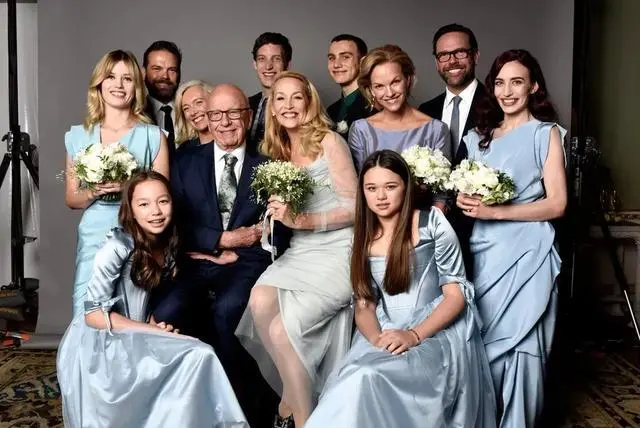 之前迎娶第四任妻子Jerry Hall,姐妹俩就充当花童,后面站着的正是默多克的其他子女,这样和谐的全家福现在恐怕也难再凑齐。