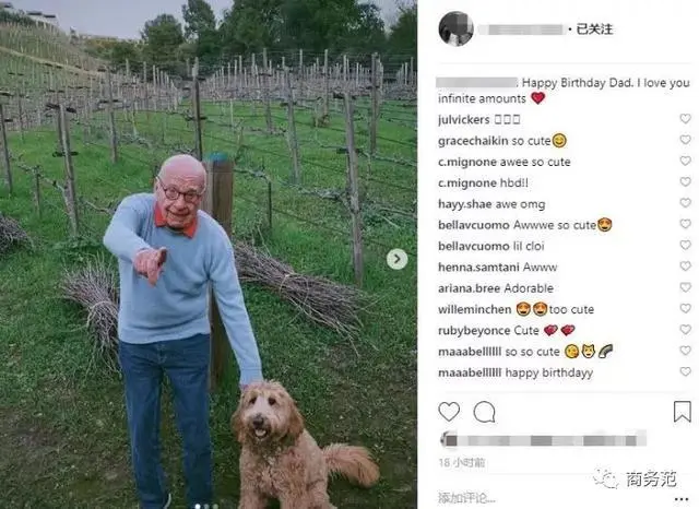 每年默多克过生日,姐妹俩都会定点发祝福。比如会配上一张默多克的照片,以及"爸爸生日快乐,爱你无限量”的配文,情绪价值拉满。
