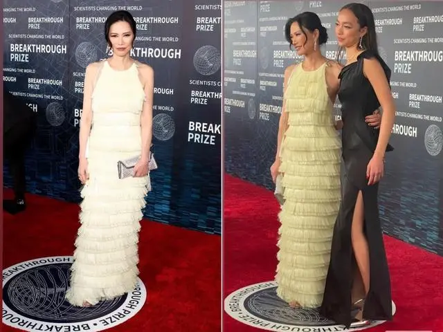 Chloe之前也跟着邓文迪亮相科学突破奖红毯。身穿缎面小黑裙,邓文迪则身穿鹅黄色GUOPEI高定流苏裙。