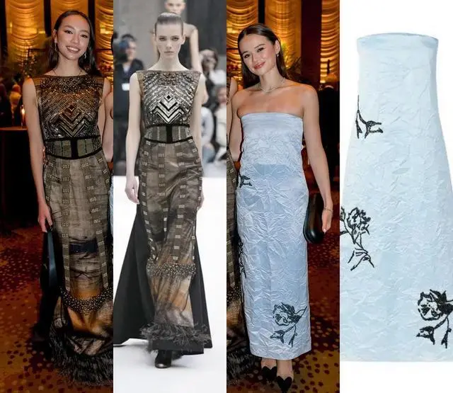 两个女儿的穿搭感觉也像妈妈挑的,24岁姐姐Grace穿Erdem蓝色艺术印花长裙,22岁妹妹Chloe则是Alberta Ferretti的古董裙,辨识度很高。