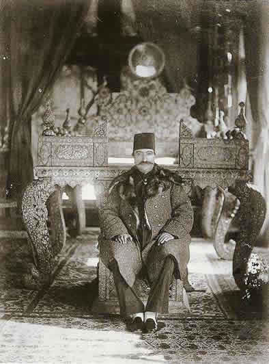 纳赛尔丁·沙 (Naser al-Din Shah) 坐在镜厅太阳王座的台阶上