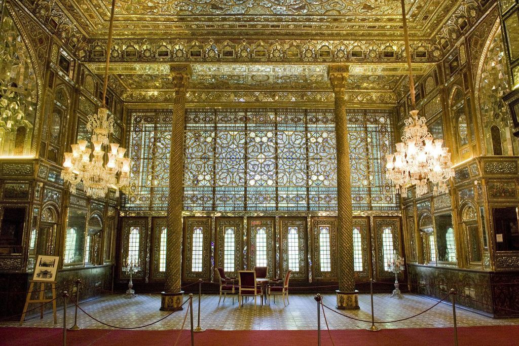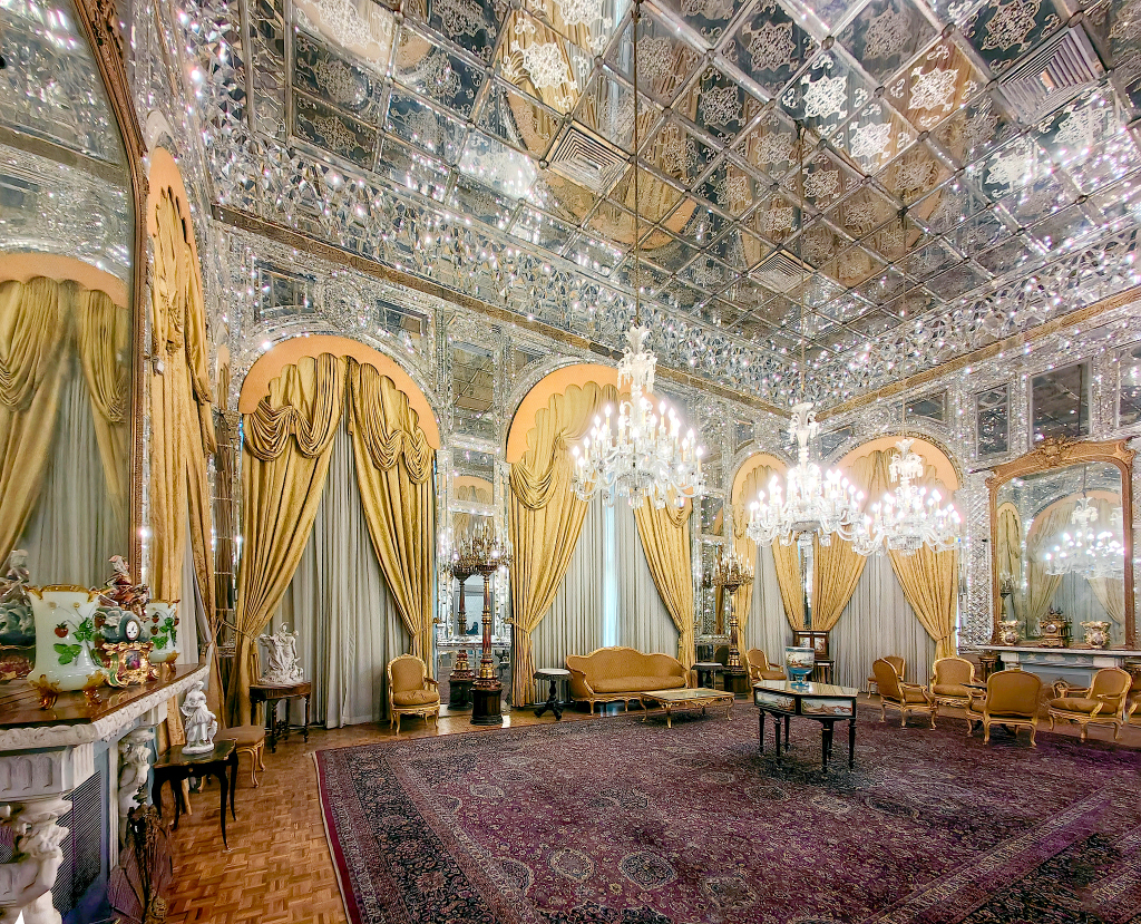 全宫殿内最令人瞠目的空间,则非镜厅(Talar-e Aineh)莫属。据说这座建筑是专门为孔雀宝座而建。整个空间四壁与穹顶贴满了数以百万计的菱形小镜片,在水晶吊灯下制造出令人目眩的漫反射效果,令人感觉身处于巨型万花筒。