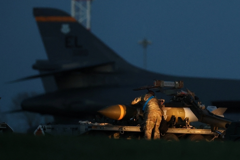 2026年3月11日,英国格洛斯特郡费尔福德,美以与伊朗冲突期间,美军人员使用的费尔福德空军基地内,地勤人员正在处理弹药。 IC Photo