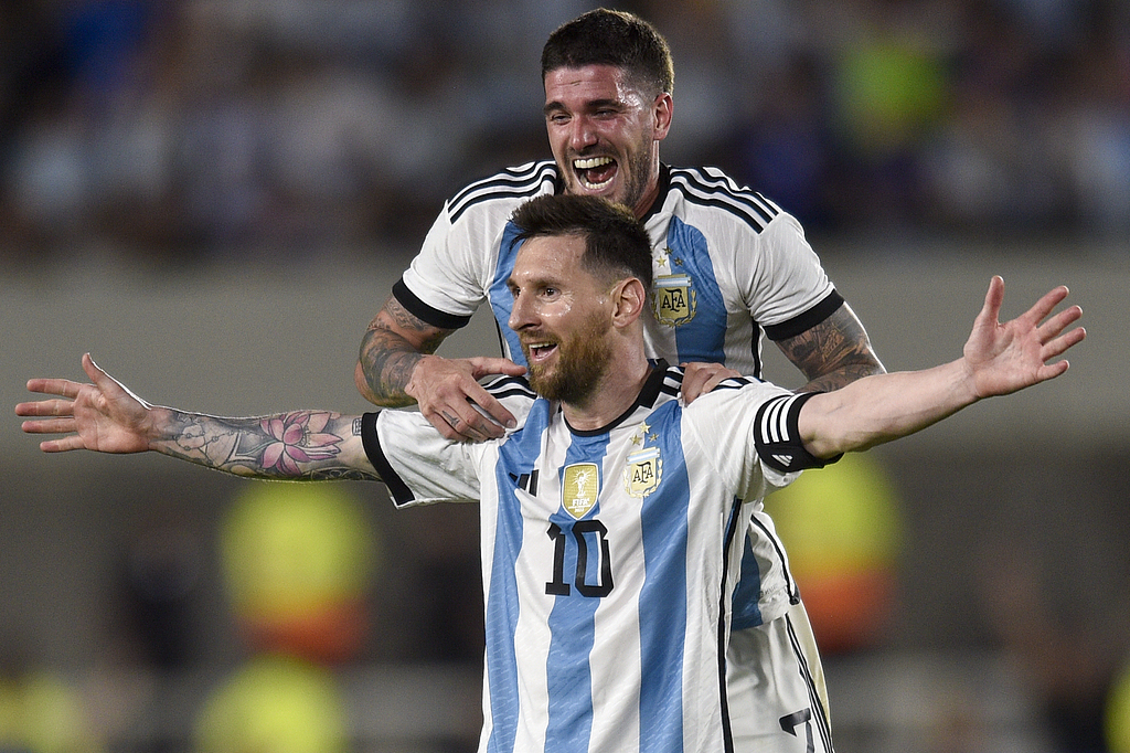 梅西庆祝自己打入第800球。