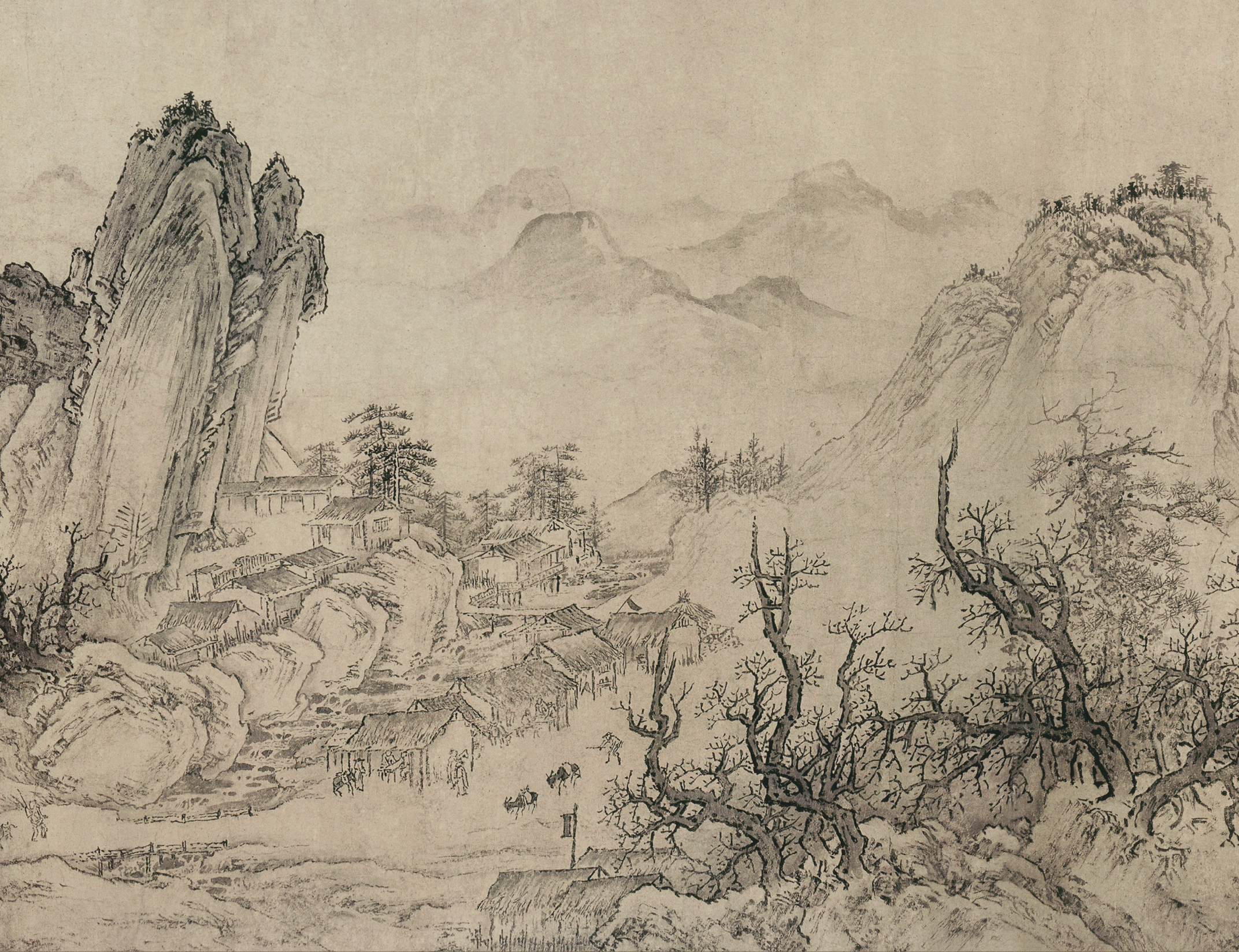 与“马一角”对比来看,《晴峦萧寺图》则展现了北宋全景式北方山水的典型风貌。此画传为北宋李成所作,关仝的“峭拔”、李成的“旷远”、范宽的“雄杰”,历来被称为“三家山水”。此作描绘冬日幽谷双峰耸峙、瀑布直泻,寺塔楼阁隐于寒林之间,行旅板桥点缀其中,意境清寂雄浑。《宣和画谱》论及李成山水,谓其“所画山林薮泽,平远险易,萦带曲折,飞流危栈,断桥绝涧,风雨晦明,烟云雪雾之状,一皆吐其胸中而写于笔下”。画作左上钤有北宋“尚书省印”,曾著录于《宣和画谱》,是学界公认的李成画风核心代表作,体现了北方山水的旷远气象。