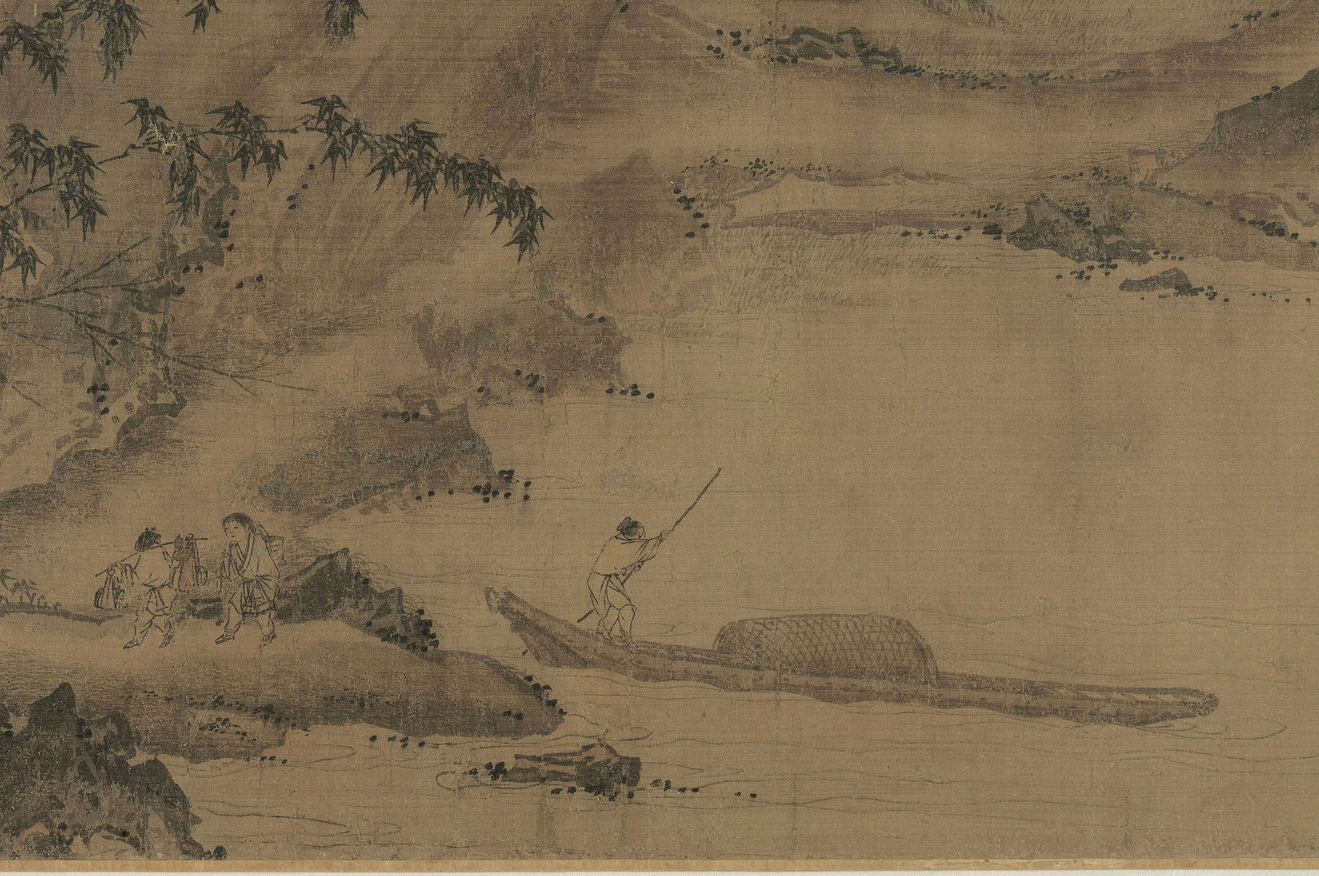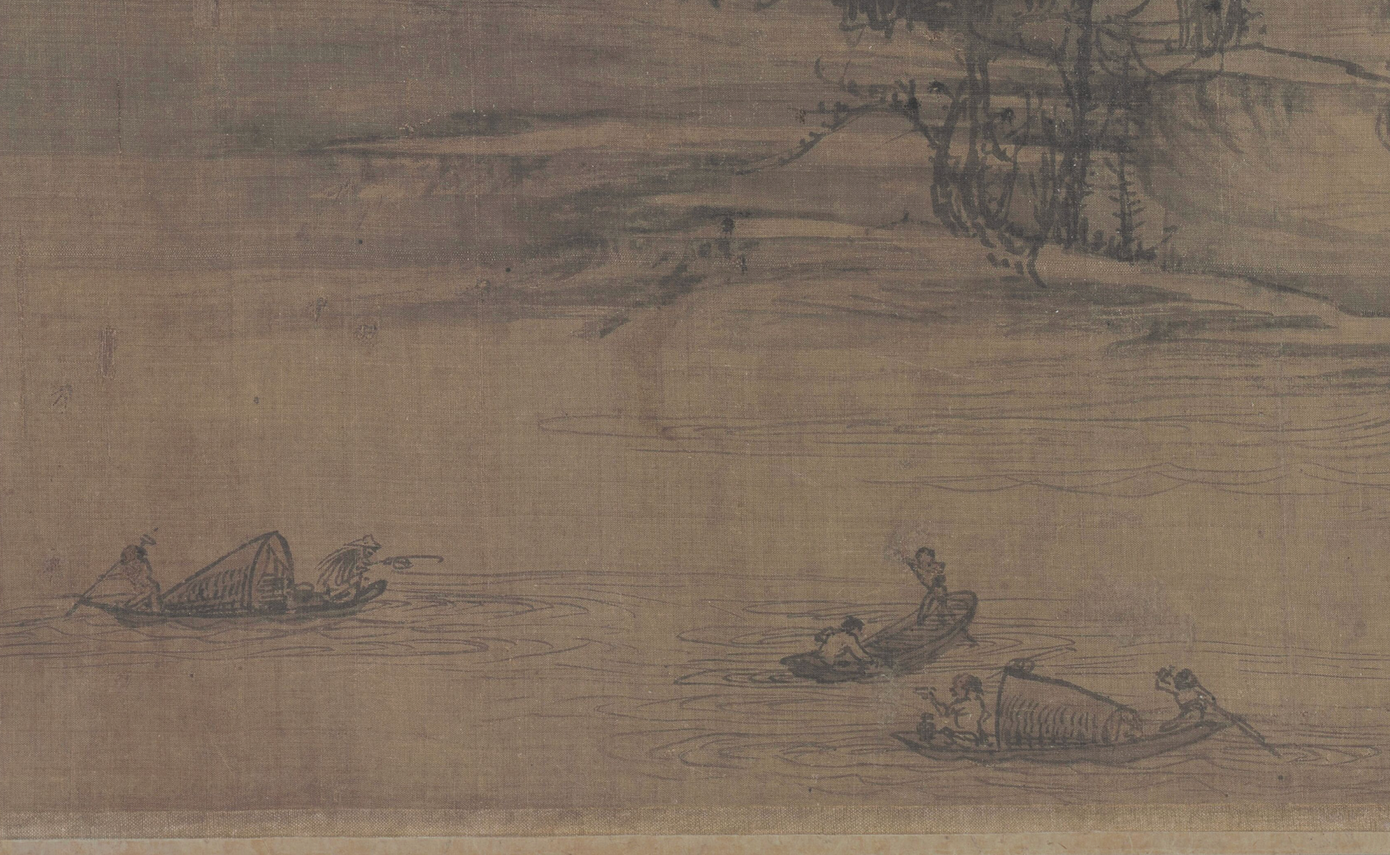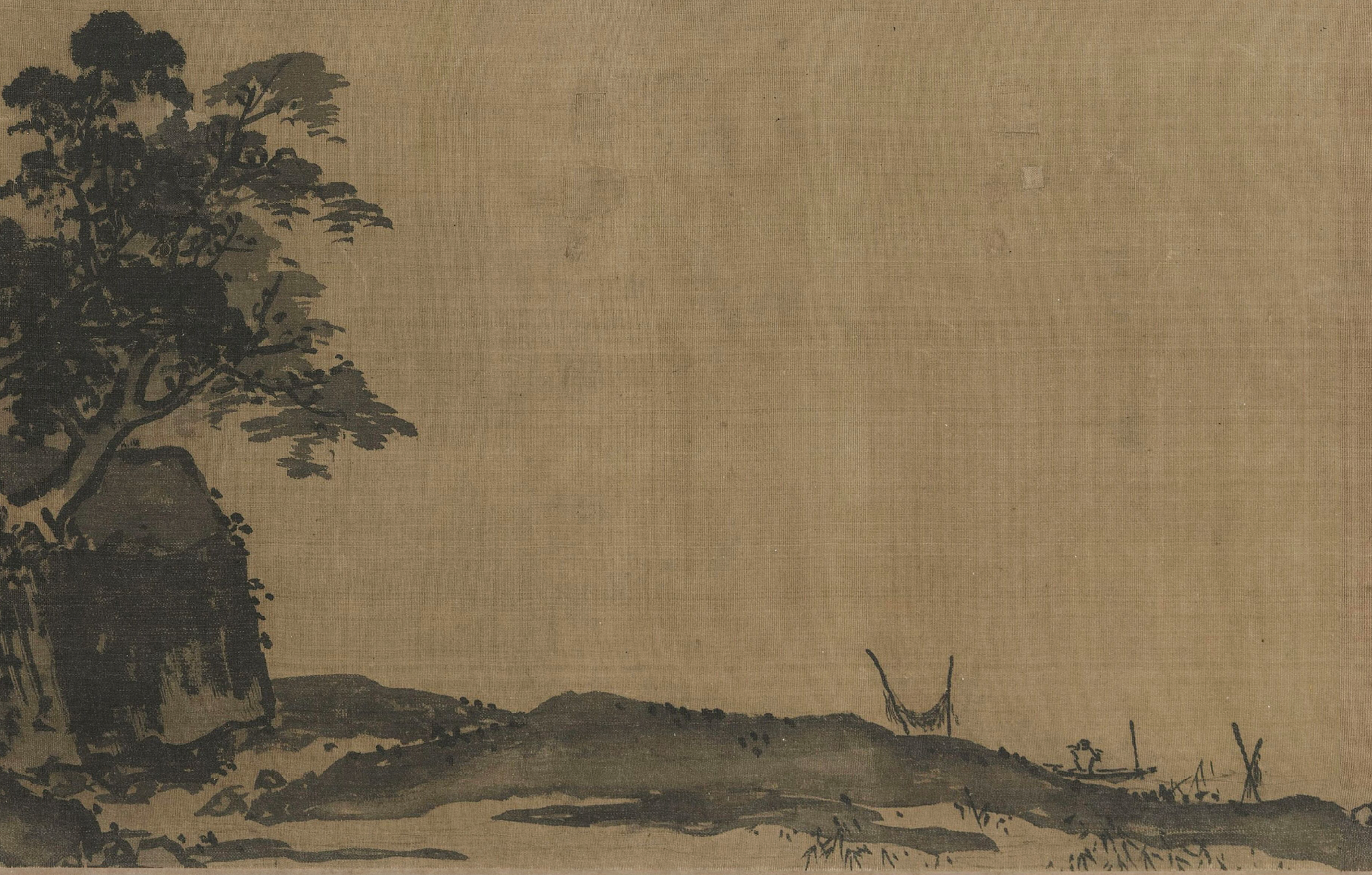 同为北宋佳作,许道宁《秋江渔艇图》(又名《渔父图》)为清宫旧藏,于1933年入藏纳尔逊-阿特金斯艺术博物馆。许道宁是李成、范宽之后北方山水画派的重要传承者,宋人评价其“得李成之气”,画中仍可见到脱胎自李成画法的湿润渲染、笔踪不显及大气迷蒙的效果。