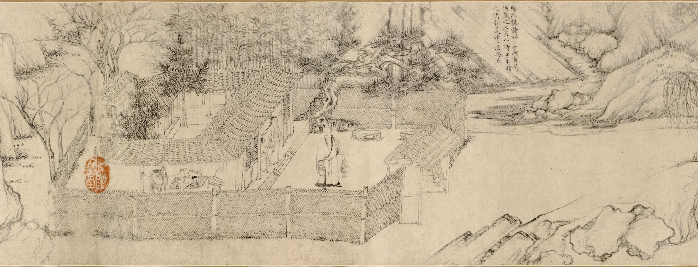 马远是南宋“光宗”、“宁宗”两朝的宫廷画师,祖上数代多人供职于宫廷画院。马远素有“马一角”之称,以局部取景的边角构图见长,此卷虽与其中典型风格有所差异,但以劲健衣纹、清雅设色,实现了院体山水的细腻严谨与文人雅趣的有机融合,笔墨上承袭李唐早期绘画的繁密周到,人物刻画生动传神,充分展现出春日闲适高旷的意境。需说明的是,此图无作者款识,外包首有“宋马远绘春游赋诗图”题签,曾被认为描绘北宋“西园雅集”典故,经考证与米芾《西园雅集图记》记载不符,故本次展览沿用《春游赋诗图》定名。