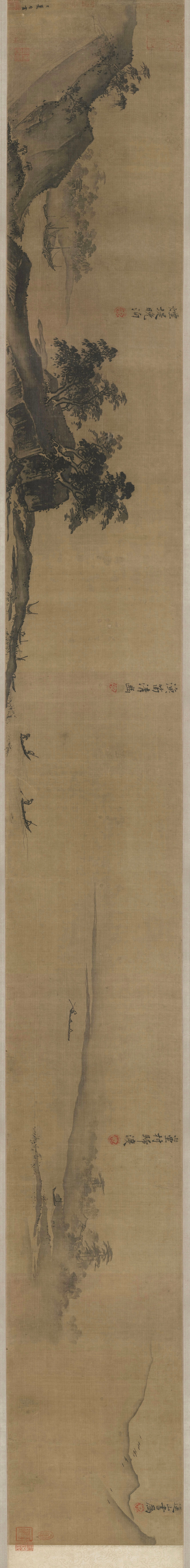 《林峦积翠图》的成画年代有南宋及元代二说。江参生活在两宋之交,他的画风以学习董源、巨然著称,能将南方山水的清润与北方山水的气韵相融合。画卷起首,岸边林木葱郁,林间掩映着小路和三四间村舍,充满生活气息;随着画卷展开,群峰连绵起伏,屋舍、梵宇、宝塔错落其间,树影摇曳;远景则江天一色,沙渚遥岑以淡墨渲染,若隐若现于烟岚之中。