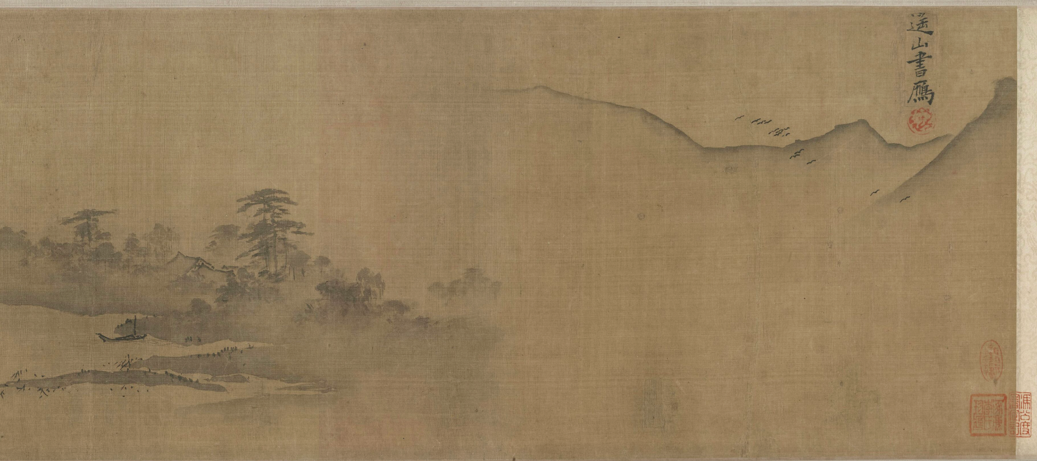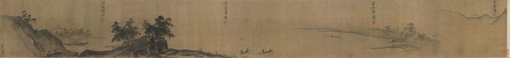 “南宋四家”之一夏圭的《山水十二景图》残卷是其“半边山水”风格的代表作,现存四景构图留白大胆,笔墨苍劲简练,江天清旷的意境中蕴含诗画相融的艺术韵味,延续了南宋院体山水的风格。原图十二段绘十二景,如今只有四景。如果说马远的“一角”构图更偏向于奇峭、紧张(山石多作尖角,画面张力更强),那么夏圭的“半边”则更倾向于空濛、清润,常以湿润的墨色营造出江南烟雨的朦胧之感。