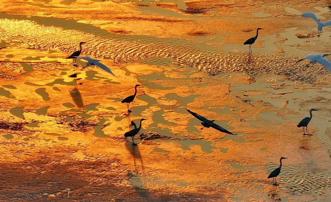 3月22日,候鸟在松花江哈尔滨段浅滩中休息觅食(无人机照片)。新华社发(杨威摄)
