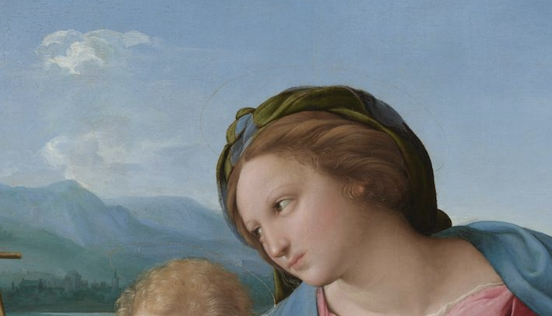 对于风景的刻画则是拉斐尔众多才华中常被忽视的方面。《阿尔瓦圣母》背景中充满了耐人寻味的细节——小小的骑士、栩栩如生的建筑,以及逼真的云彩。在班巴赫看来,这幅画仍然与我们当下所处的世界紧密相连。画作的前景部分像是一幅植物学研究。目光所及之处,处处都体现着拉斐尔对自然现实的精准把握,令人叹为观止。