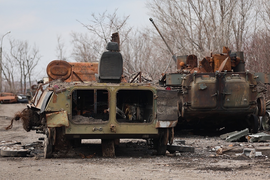 3月19日,顿涅茨克地区,乌克兰武装部队的军事装备被摧毁。(视觉中国)