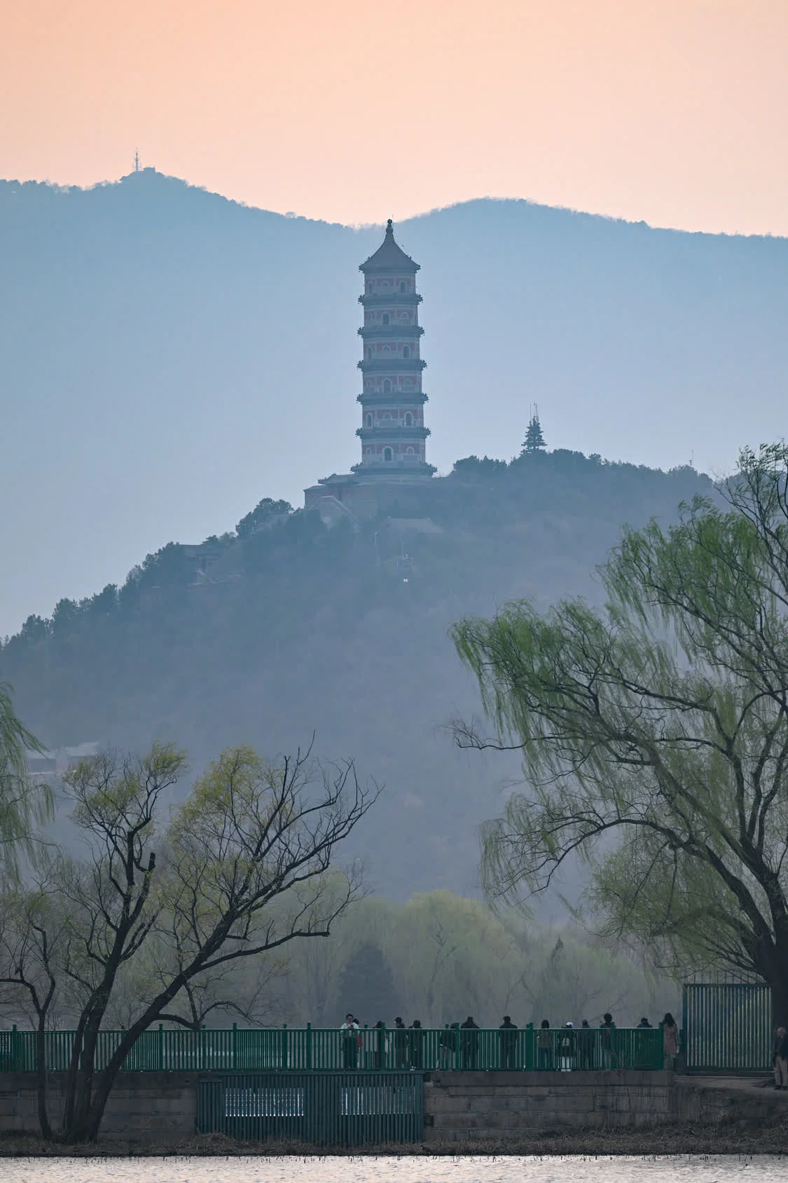 3月27日,人们在北京颐和园远眺远处的玉泉山玉峰塔。新华社记者 辛悦卫 摄