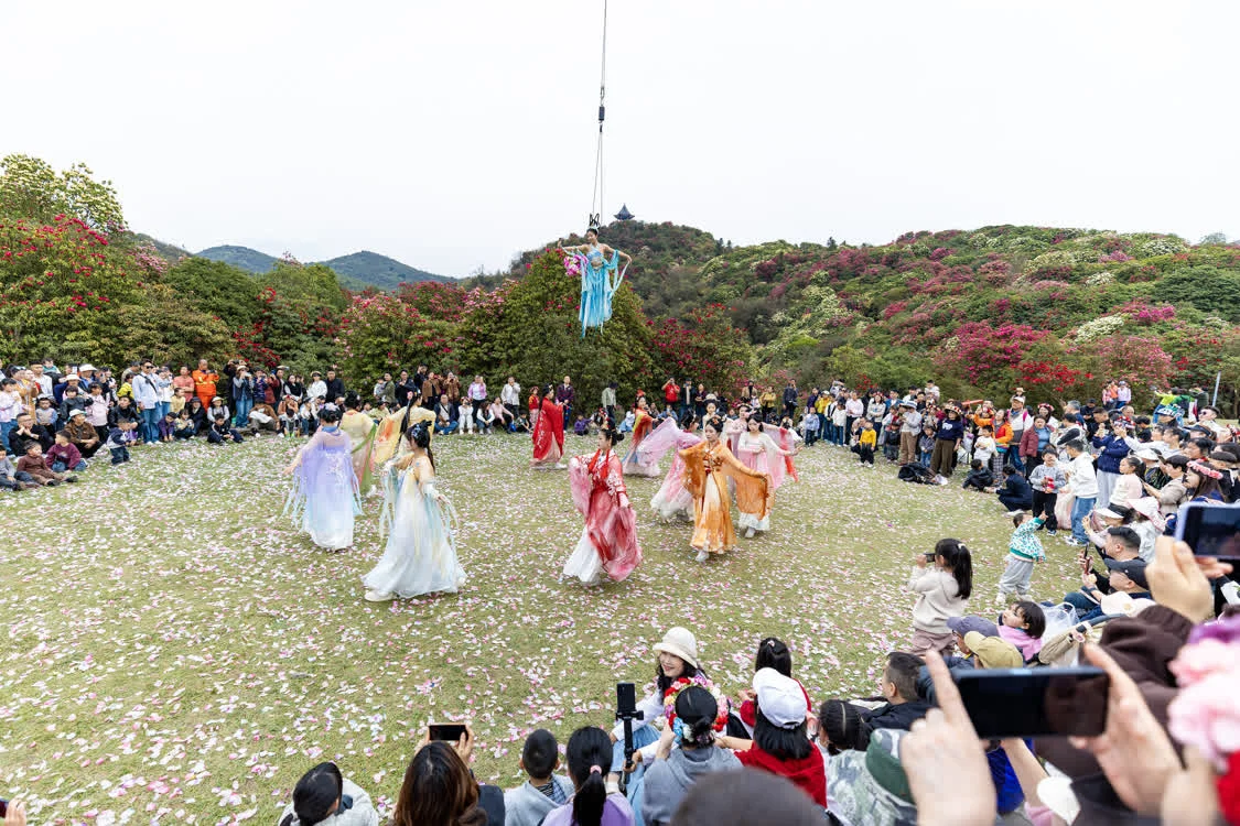 3月26日,“花仙子”在百里杜鹃管理区普底景区为游客表演“天女散花”。新华社发(范晖摄)