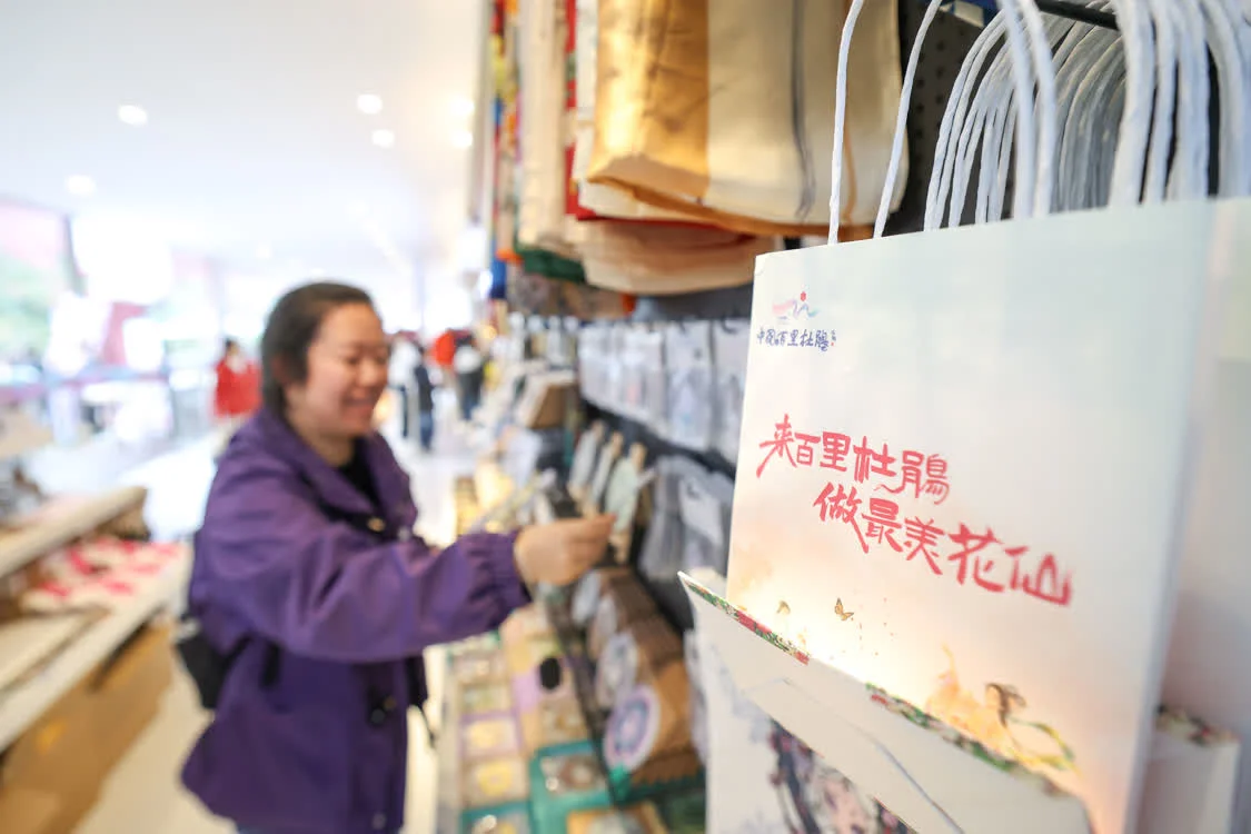 3月28日,游客在百里杜鹃管理区金坡景区花仙能量补给站内选购文创产品。新华社发(韩贤普摄)