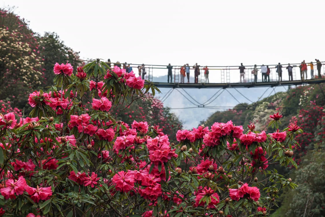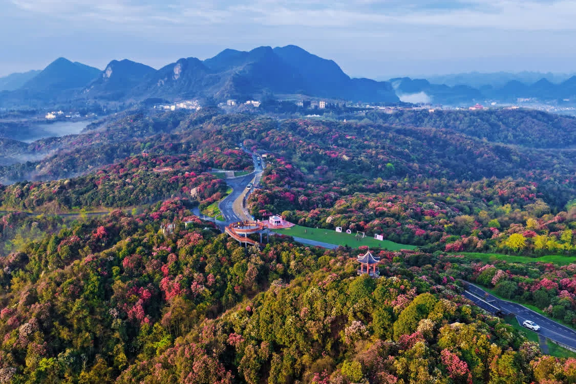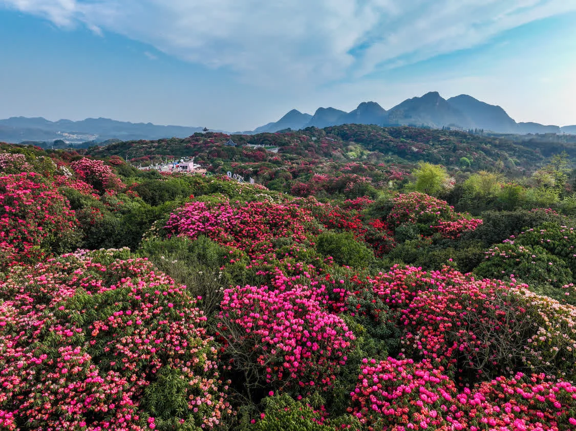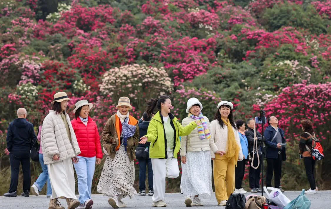 “几日春风又春雨,杜鹃依旧映山红。”这是清代阮元描绘杜鹃花的诗句。近日,贵州省毕节市百里杜鹃管理区内的杜鹃花迎来盛花期。杜鹃花是中国三大自然野生名花之一,也是世界四大高山花卉之一。百里杜鹃管理区内分布着绵延125.8平方公里的原始杜鹃林带,每年三四月份,40多个品种的杜鹃花竞相盛开,“地球彩带,世界花园”的独特魅力,吸引着来自各地的游客。漫山遍野的杜鹃花引爆旅游市场的同时,还带动杜鹃文创、花卉培育、特色民宿等产业蓬勃发展。据了解,百里杜鹃管理区2025年共接待游客超800万人次,花卉培育产业产值超1000万元,让得天独厚的美丽风景不断转化为“美丽经济”。
