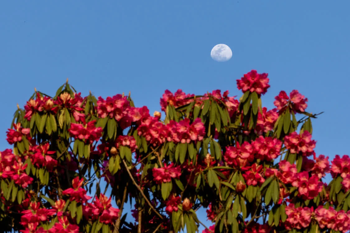 3月29日在百里杜鹃管理区普底景区拍摄的杜鹃花和月亮。新华社发(李华摄)