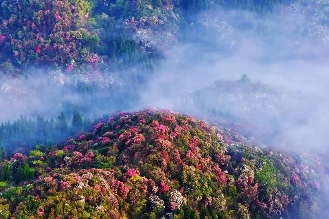 4月1日在百里杜鹃管理区普底景区拍摄的晨雾中的杜鹃花(无人机照片)。新华社发(陈鹤摄)