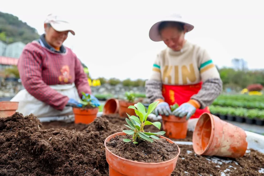 3月28日,工人在百里杜鹃管理区汇境花卉科技园管护杜鹃花苗。新华社发(韩贤普摄)