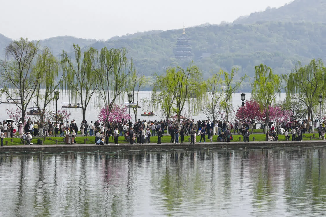 4月2日,游客在杭州西湖景区的白堤上游览。新华社记者 黄宗治 摄